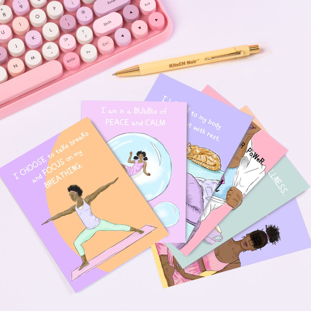 A gorgeous 6 pack of rest and stress relief affirmation post cards, alongside quirky illustrations of beautiful black women! Each statement runs alongside the 'Rest and stress relief' Affirmations' session hosted by founder, Cherelle. View the video to accompany the cards below x