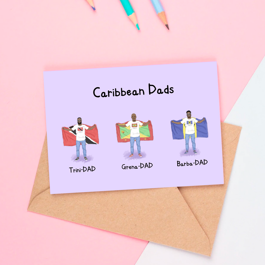 The perfect card for that Caribbean father who reps the small islands! Is he from the west indies? If so, this card will definitely tickle his fancy! The card portrays 3 beautifully illustrated black men flying the flags for their islands - Trinidad, Grenada and Barbados. Proudly representing Caribbean dads on a whole!