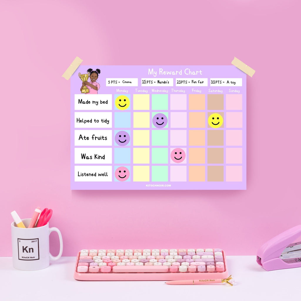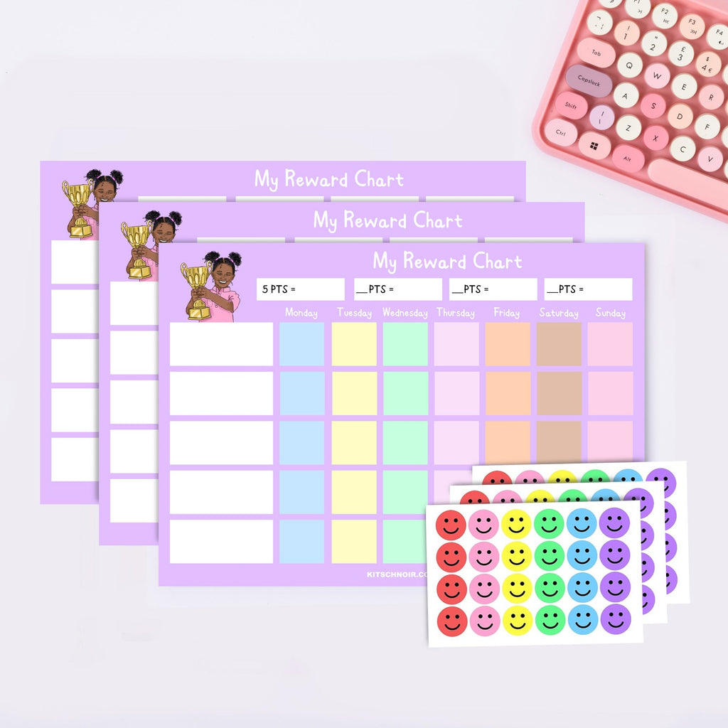 This KitsCH Noir reward chart is the perfect tool for motivating your child to achieve their goals! Featuring a beautiful illustration of a cute, little black girl holding a trophy, this chart is motivating, inspiring and representational. Whether it's for improving grades, completing household chores, or learning new skills, this reward chart will help your child stay on track and motivated.