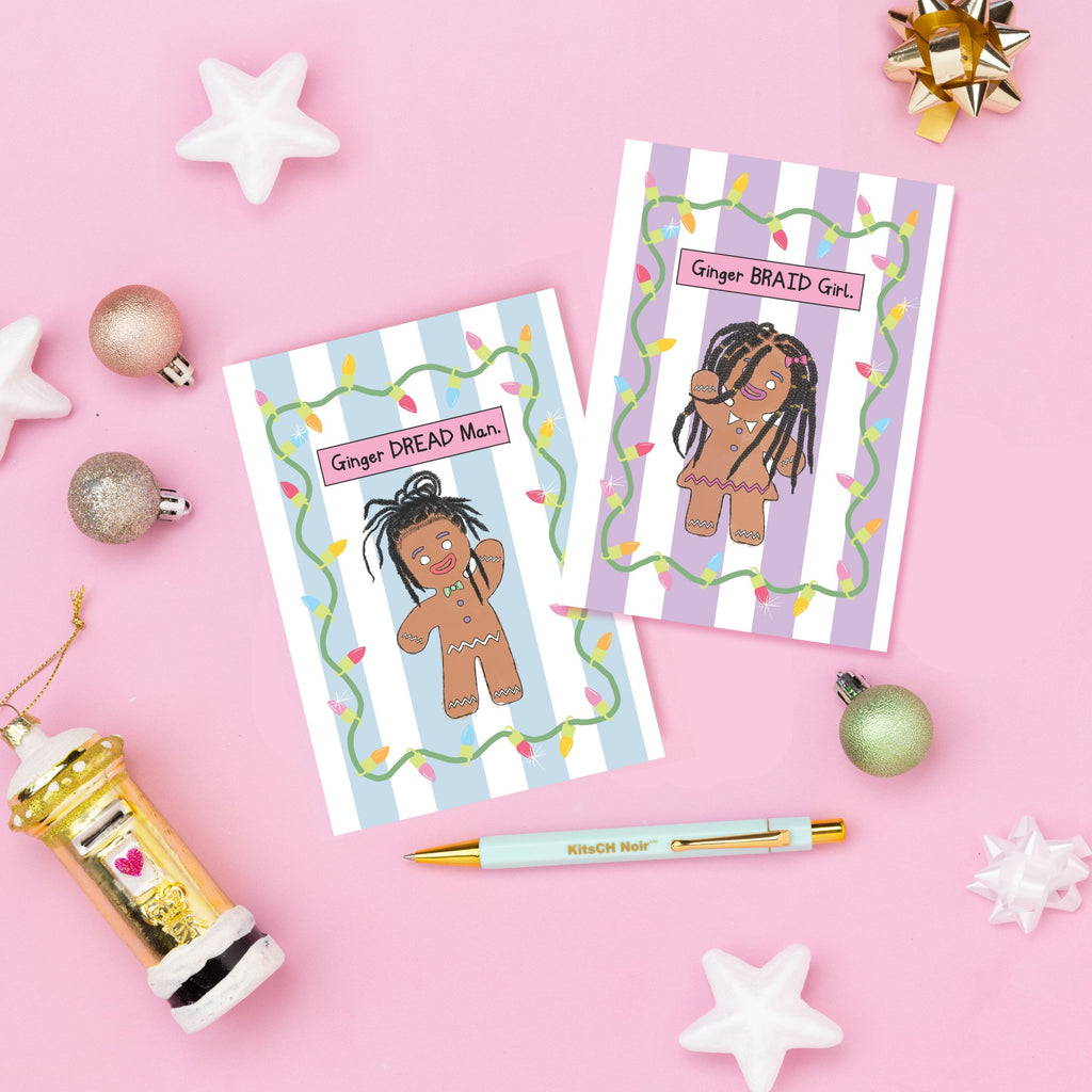 The most beautifully illustrated cards that you wish you were able to hand out to your classmates when you were younger. Fun and quirky illustrations, of a gingerbread men and women...but we like to add a bit of spice, so in true KitsCH Noir fashion...Issa  Ginger DREAD Man! Inspired by our love of natural hair and locs.