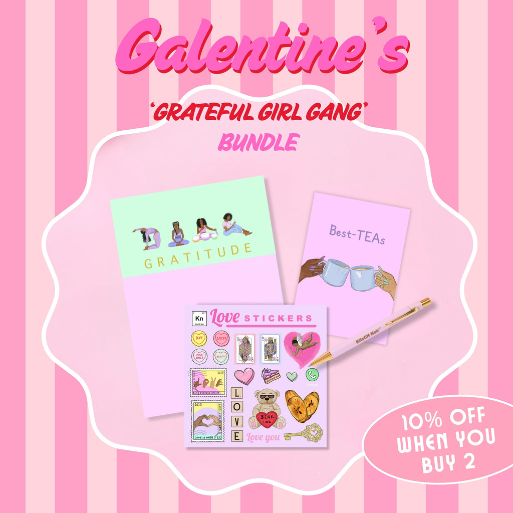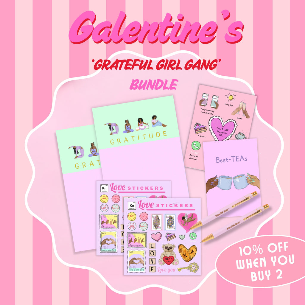 The perfect Galentine’s Day gift for your besties. Gratitude notepads, love stickers & pen by Black-owned stationery brand Kitsch Noir.