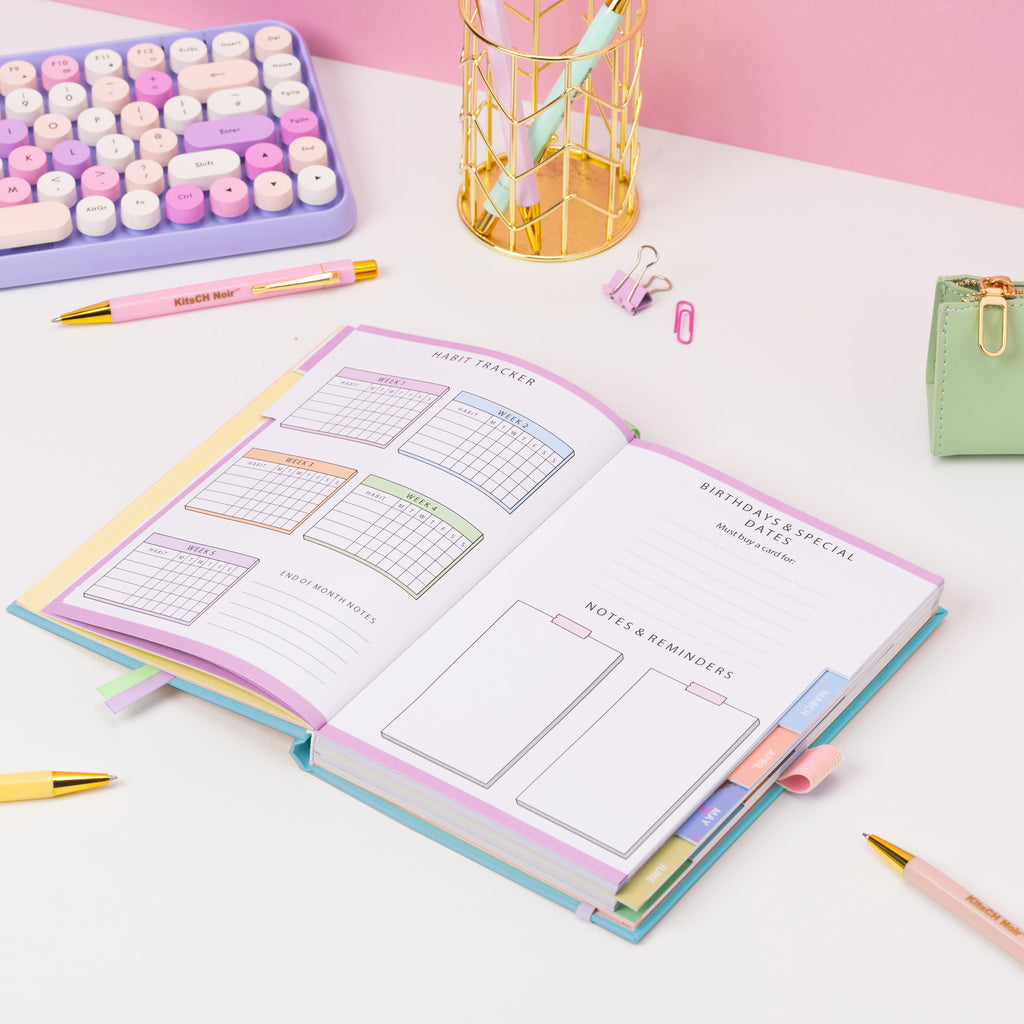 Start each month with an optimistic and empowering affirmation to focus on. We have also created a helpful reminder (double) page for you to list important dates that month and for personal points you wish to focus on. Every month is tabbed with pastel colours and begins with a signature KitsCH Noir illustration of a beautiful black woman. A blank reflection page is placed at the end of each month for you to insert notes, new goals and recollections on great events that happened or improvements to be made next month. The back of the dairy reveals a secret back pocket which hides to large sticker sheets. Each diary has 2 beautiful ribbon book marks attached to help you easily navigate important pages you wish to regularly return to.